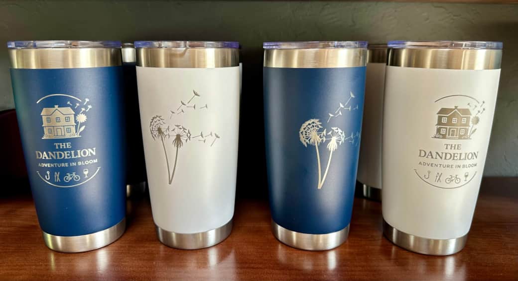 One side features our beloved Dandelion logo — your home base for Adventure in Bloom — complete with all the icons of a life well-lived: fishing, dining, cycling, and sipping. The other side? A gorgeous dandelion in full bloom, seeds floating away on the wind like tiny little dreams.